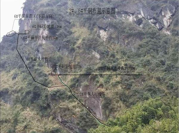 金雞峽水庫壩址勘探平硐大多位于較高陡峭懸崖上,在6個平硐中,只有5#平硐在公路旁,其余5個平硐均位于半山腰高差30m~170m不等,需搭設人行棧道方能達到洞口位置。1#平硐位于玉溪河河床以上約30m的左岸山體上,人工搭設棧道約160m;2#平硐位于右岸公路以上約70m,人工搭設棧道約100m,為保證出渣安全,另搭設出渣通道約60m;3#、4#平硐分別位于玉溪河河床以上約170m、100m的左岸陡峭山壁上,上山通道約400m;6#平硐位于右岸公路以上約140m。