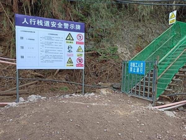 根據現場作業環境,將安全管理規范化。必要的安全警示標識、安全標語口號,必須有、必須立,營造安全生產氣氛,讓視覺化教育潛移默化員工行為。臨空臨水陡壁等危險地帶必要的安全防護設施不能少,做到及時同步跟進。在施工期間,安排專人每天早上對棧道進行安全檢查,主要檢查棧道立桿和錨桿的連接情況、安全鋼絲繩連接是否牢固、扣件的螺絲是否有松動、扣件是否有破裂、防護網是否有破損等。制定安全獎懲制度并嚴格執行,進一步提高員工執行安全管理各項規定的積極性。在施工生產例會或碰頭會上,總結安全生產工作情況,指出存在問題,制定整改措施,讓安全管理壓力有效傳遞下去,讓安全管理措施及時得以落實。