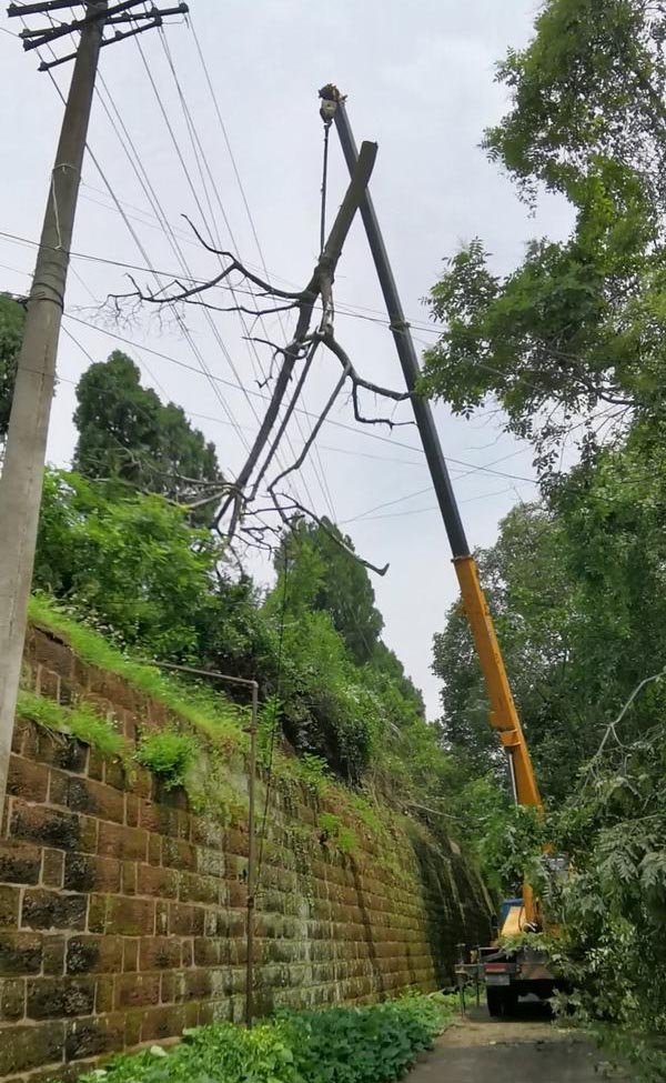 經(jīng)現(xiàn)場查看,倒伏的樹木早已枯死,根部腐爛斷裂。上部枝干全部壓在出庫線路上,電線由于承重已大幅下垂;如不及時處理,電線極有可能因承受重載而斷裂;在電線另一段,也有一顆樹木受狂風影響,倒在電線上。由于該段線路為馬鞍山倉庫片區(qū)公司老職工住戶和多戶生產(chǎn)經(jīng)營用戶進行供電,停電后,對其正常生活和生產(chǎn)經(jīng)營造成影響。為盡快消除安全隱患,減少損失,及早恢復供電,須立即對該情況進行處置。