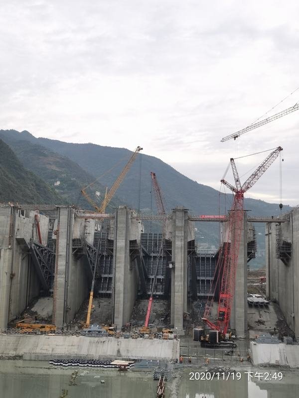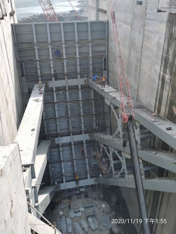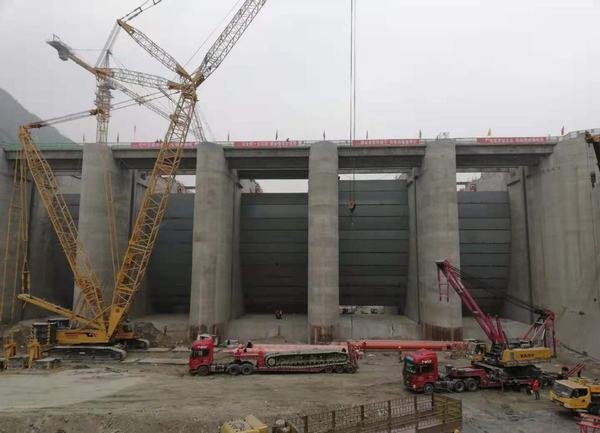 2020年12月15日,由機械廠承建的旬陽水電站左五孔金屬結構安裝項目,經過全體參戰人員81天的奮戰,順利完成了主體項目(弧門門葉、弧門支臂、弧門支鉸座、油缸支鉸、油缸、液壓啟閉機構)安裝工作。