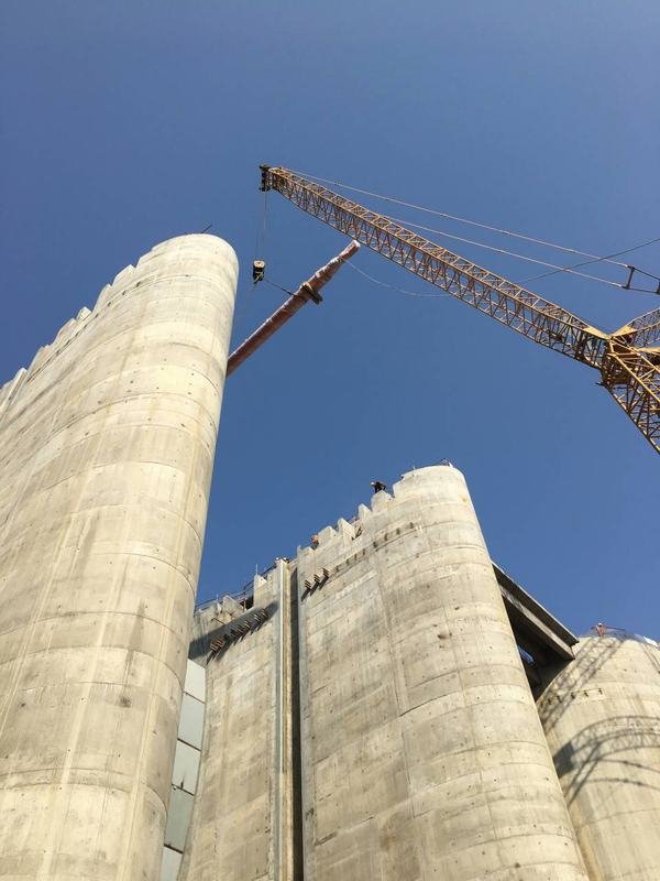 為確保此項自攬任務的優質高效完成,機械廠全力組織人員在完成前期預埋件的基礎上,于今年9月進場,進行五扇閘門的安裝。在安裝施工過程中,廠安裝一班人對弧形閘門支鉸座安裝、支臂安裝、門葉安裝的技術問題進行多番探討、嘗試,克服施工條件有限、安裝部位設計缺陷、吊裝半徑受限等困難,在吊裝時把設備操作、吊裝吊索的安裝系數提到最高,每一步都要保證人員及設備安全,做到萬無一失。面對由11節門葉組成的閘門,在安裝至第8節門葉之后,閘門弧度呈后仰狀態,人員在安裝時存在很大的安全風險,廠加大安全投入,定做強度與韌性適合的安全支撐及雙保險作業,確保人員的絕對安全,同時要求安裝人員時刻打起十二分的精神和拿出百分之百的干勁,確保工程項目安裝質量,杜絕安全事故發生。