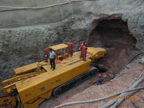 經(jīng)過1周時(shí)間的安裝,工程局第一臺(tái)懸臂式掘進(jìn)機(jī)于 2014年10月7日在王家坪隧洞出口工作面掛口正式投入運(yùn)行,武引二期西梓干渠第五標(biāo)段隧洞工程由此進(jìn)入施工高峰期。