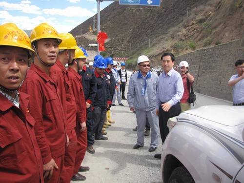 在洞松水電站首部樞紐觀景臺和首部大壩上,彩旗飄揚。我局施工人員穿戴整齊,精神飽滿地列隊歡迎王野平一行的到來。唐電鄉(xiāng)城水電開發(fā)公司總經理范正榮對川工局認真負責的工作態(tài)度及工作作風予以高度贊揚。一行人到達現(xiàn)場后,聽取了省水利設計院關于洞松水電站情況簡介,并著重了解了首部大壩的建設情況,對川工局總體進度、質量表示滿意。范正榮向王野平詳細介紹了川工局參建大唐集團公司項目的情況,王野平表示,對川工局這樣“重合同,守信譽”的單位一定要加強聯(lián)系和合作。