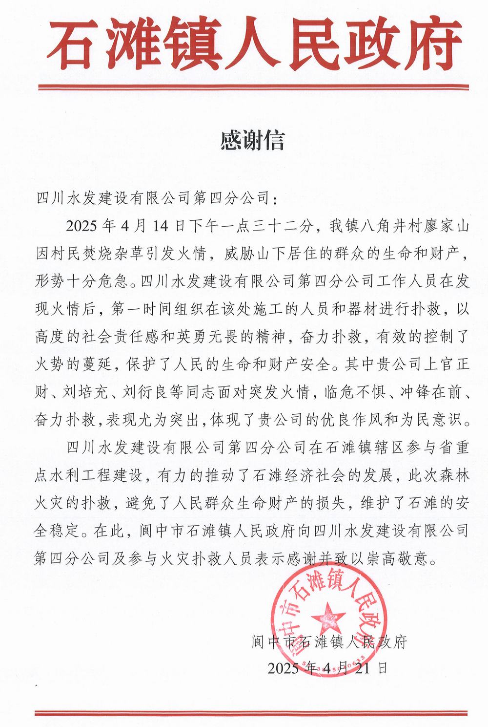 近日,四分公司收到閬中市石灘鎮(zhèn)人民政府感謝信,對四分公司扎根地方建設(shè)、積極履行社會責(zé)任給予高度認可,對其在危急時刻勇救山火、守護群眾生命財產(chǎn)安全表達誠摯感謝,并對四分公司職工展現(xiàn)出的社會責(zé)任感與英勇精神予以特別表彰。